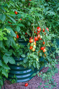In the backyard, a raised metal bed and planting areas brim with tomatoes, raspberries, and herbs, reflecting the gardener’s love of growing food close to home.